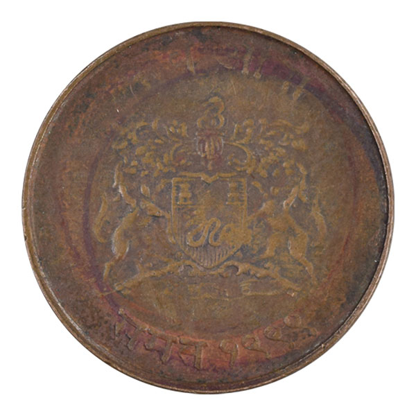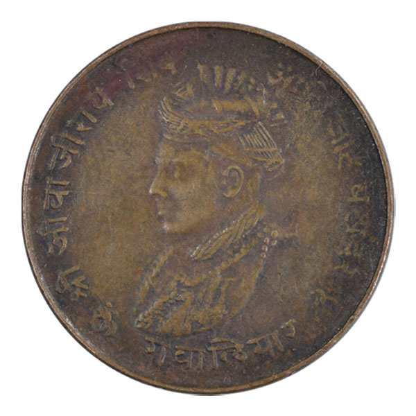 Obverse: Bust of king facing left with continuous legend of ‘Shri Jivajirav Shinde Alijah Bahadur, Gwalior’ surrounding it.