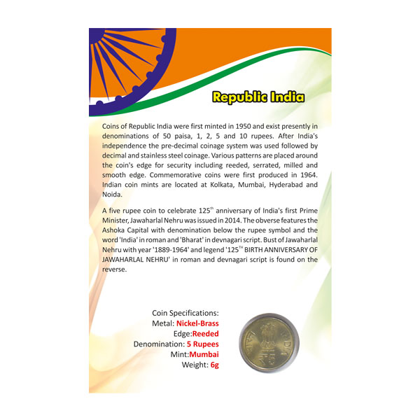 125th Birth Anniversary Of Jawaharlal Nehru 5 Rupees Commemorative Coin - Republic Of India
